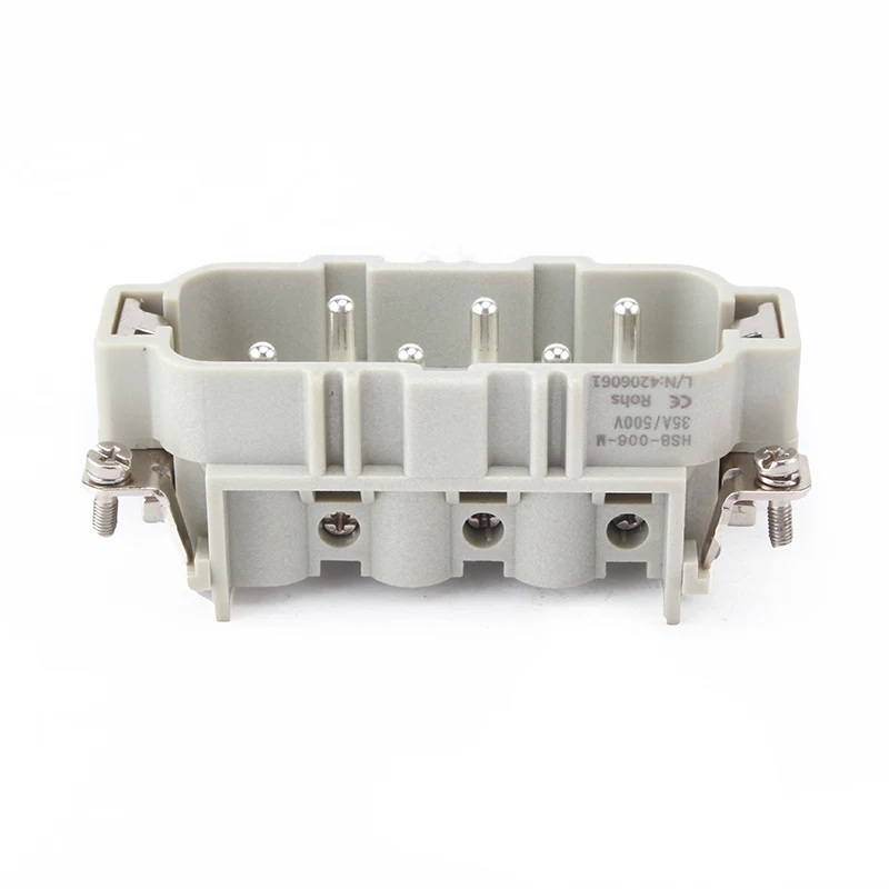 HSB-006-M Penyambung tugas berat HSB berfungsi di bawah arus 35A .35A 6 Pin Sisip Penyambung Tugas Berat ialah 6 pin atau dua kali 12 pin untuk bersentuhan dengan wayar. Ia menawarkan untuk keadaan kerja yang berbeza, dan popular digunakan dalam industri automatik dan jenis sambungan pendawaian mesin.