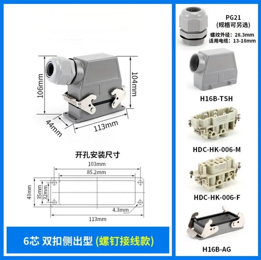 80A 4+2 Pin Insert Heavy Duty Connector berfungsi H16B-TSH aluminium Perumahan penyambung tugas berat. Ia diperbuat daripada bahan PC kekuatan dan tembaga bersalut perak .CHTAR pin tembaga disalut dengan perak kualiti yang baik dan kekonduksian elektrik yang lebih baik. Ia mengandungi getah meterai untuk menjadikannya ciri kalis air yang baik.