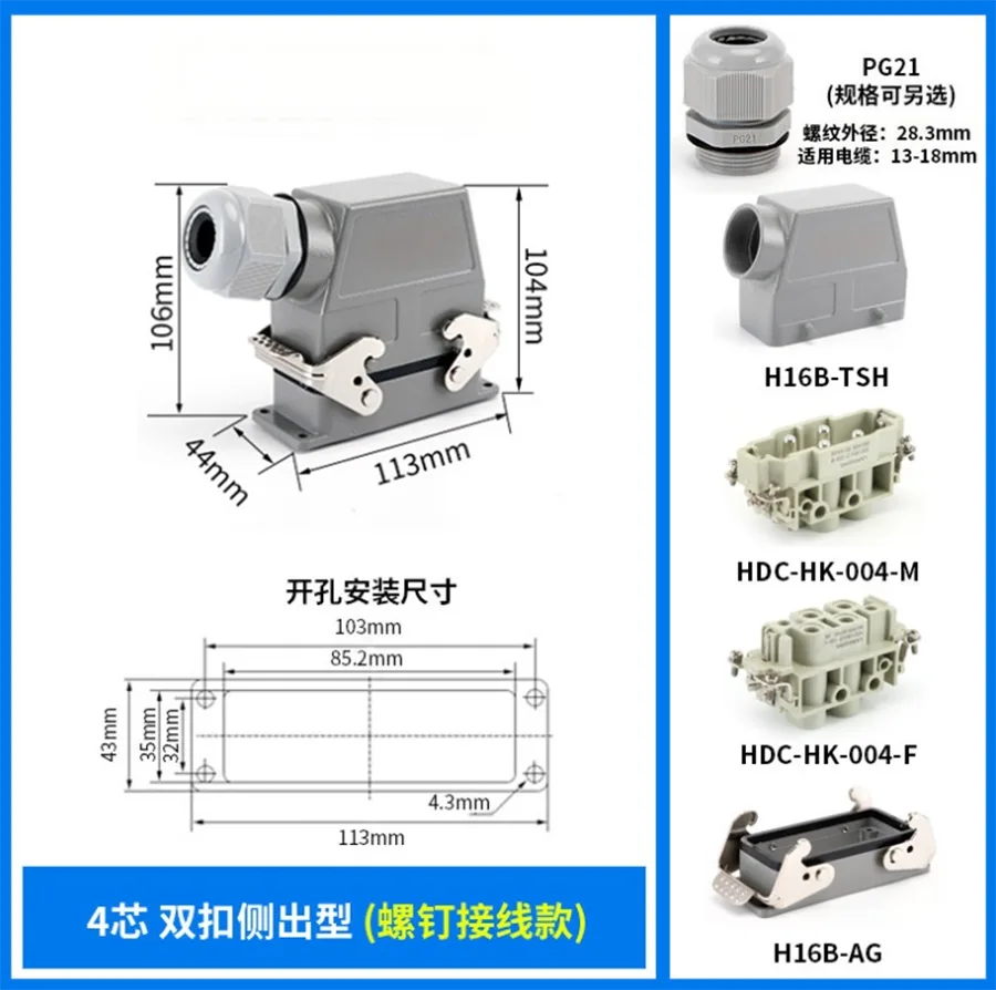 HK-004/0-M HK Penyambung tugas berat berfungsi di bawah arus 80A. Ia adalah 4 pin untuk dihubungi dengan wayar. Ia menawarkan untuk keadaan kerja yang berbeza, dan popular digunakan dalam industri automatik dan jenis sambungan pendawaian mesin.