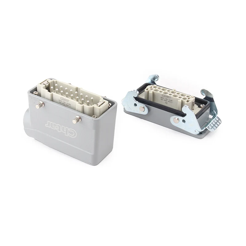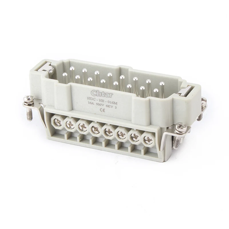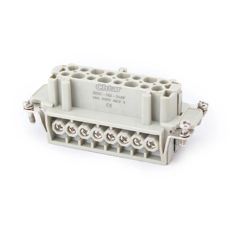 Penyambung tugas berat 16A HE-016-F/M termaju CHTAR ialah Penyambung Tugas Berat Sisipan M/F 16 Pin. Ia mempunyai bahagian lelaki dan perempuan. Ia serasi dengan penyambung tugas berat shell H16B. Biasanya, komponen lelaki dipasang di perumahan lelaki, atau ia boleh dipasang dalam komponen wanita untuk pemasangan terbalik mengikut keperluan pelanggan. Bahan sarung PC yang kukuh dan pin tembaga bersalut perak memastikan kekonduksian dan kelebihan operasi penyambung tugas berat palam M/F 16 pin.